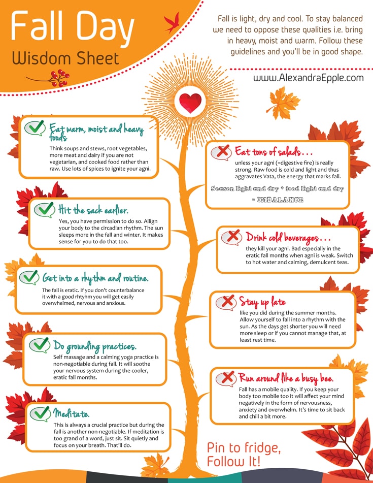 I have created a Fall Wisdom Sheet for you that summarizes the do’s and dont’s for fall. Print it, put in on your fridge and put it into action.